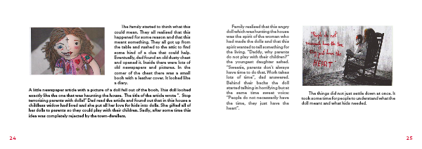 Family realised that this angry doll which was hunting the house was the spirit of the woman who had made the dolls and that this spirit wanted to tell something for the living. “Daddy, why parents do not play with their children?“ the youngest daughter asked. “Sweetie, parents don‘t always have time to do that. Work takes lots of time“, dad answered. Behind their backs the doll started talking in horrifying but at the same time sweet voice: “People do not necessarily have the time, they just have the heart“.