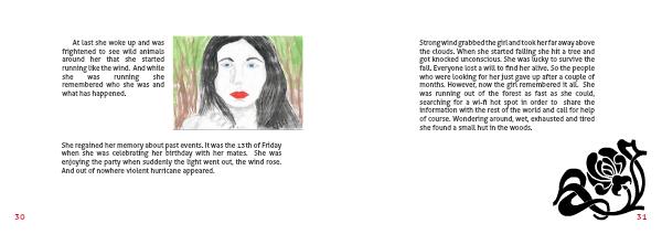 Strong wind grabbed the girl and took her far away above the clouds. When she started falling she hit a tree and got knocked unconscious. She was lucky to survive the fall. Everyone lost a will to find her alive. So the people who were looking for her just gave up after a couple of months. However, now the girl remembered it all. She was running out of the forest as fast as she could, searching for a wi-fi hot spot in order to share the information with the rest of the world and call for help of course. Wondering around, wet, exhausted and tired she found a small hut in the woods.