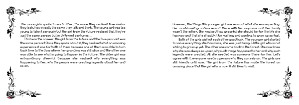 Both of the girls wished each other good luck. The younger girl started to value everything she has more, she was just being a little girl who is not whiling to grow up yet. The other one came back to the forest. She now knew why she was always so upset, why such things happened to her and why such legends were created. All she needed was someone there for her. Let’s agree with it, everyone needs a person who they can rely on. The girls are still friends until now. The girl from the future has made the forest an amazing place that the girl who is now 10 still likes to visit.