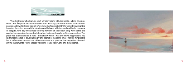 ‘‘You don‘t know who I am, do you? My story starts with the words - a long time ago, when I was five years old my family lived in an amazing place near the sea. I had beloved parents and my childhood was full of joy. I was the happiest girl in the world. Every morning I greeted the rising sun and the blowing wind I played with the sand and had a company of seagulls. One day when I was enjoying my time on the beach a big wave came and washed me deep into the sea. Luckily, when I woke up, I saw lots of trees around me. The place was the one we are in now. I didn‘t know where I was and why it happened to me, and what I needed to do. I was angry and scared at the same time. I wanted my parents back... After some moments an old woman came and gave me that ring with a diamond saying these words, ‘‘ Your escape will come to you itself‘‘, and she disappeared.