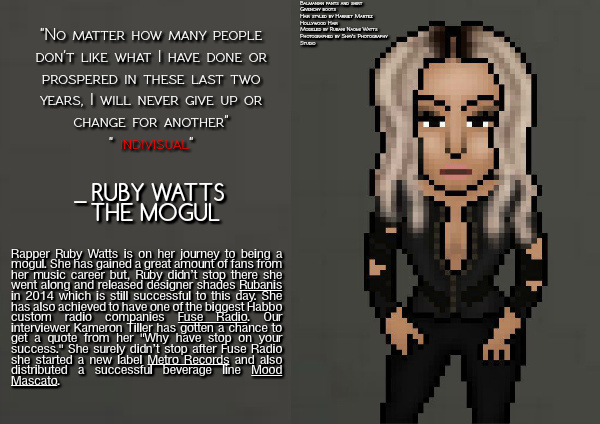 Rapper Ruby Watts is on her journey to being a mogul. She has gained a great amount of fans from her music career but, Ruby didn't stop there she went along and released designer shades Rubanis in 2014 which is still successful to this day. She has also achieved to have one of the biggest Habbo custom radio companies Fuse Radio. Our interviewer Kameron Tiller has gotten a chance to get a quote from her "Why have stop on your success." She surely didn't stop after Fuse Radio she started a new label Metro Records and also distributed a successful beverage line Mood Mascato.