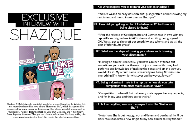 "After the release of Get Right, Bre and Carmen was in awe with my rap skills and signed me ASAP. Its fun and exciting being signed to CHI. We all get to show off our creativity and talents and we all the best of friends.. its great"