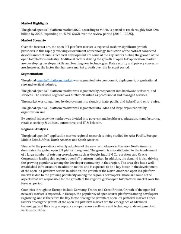 Thanks to the prevalence of early adopters of the new technologies in this area North America dominates the global open IoT platform segment . The growth is also attributed to the involvement of a large number of existing core players such as Google , Inc ., IBM Corporation , and Oracle Corporation leading this region ' s open IoT platform market . In addition , the demand is also driving the growing popularity among the developer community in that region . The area also has a wellestablished infrastructure in addition to this , and is expected to be a key factor in the development of the open IoT platform sector . In addition , the growth of the North American open IoT platform market is due to the growing popularity among the region ' s developers . Those are some of the aspects that are responsible for the growth of the region ' s global open IoT platform market over the forecast period .