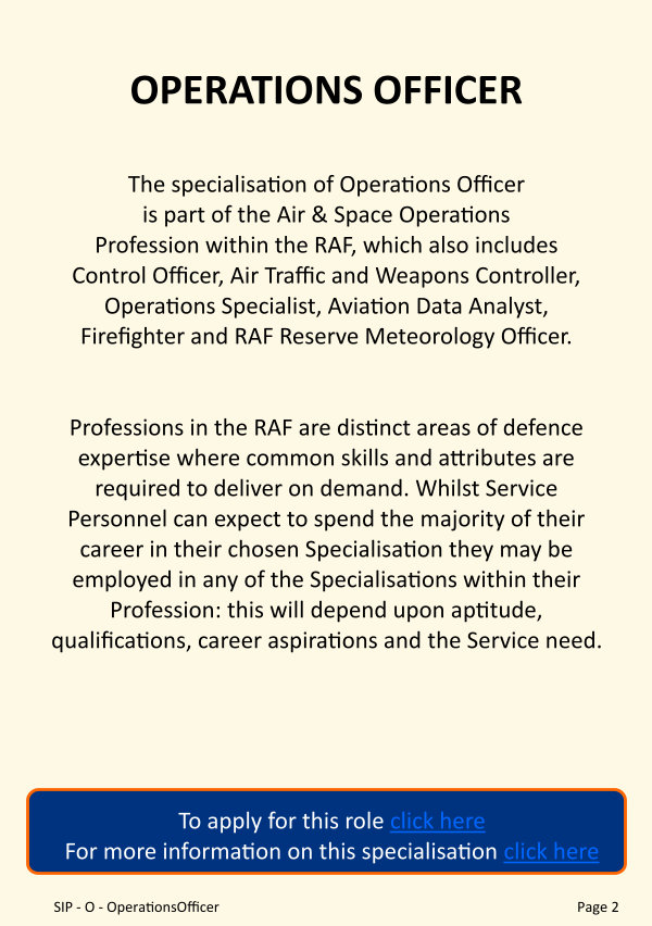 The specialisation of Operations Officer is part of the Air & Space Operations Profession within the RAF, which also includes Control Officer, Air Traffic and Weapons Controller, Operations Specialist, Aviation Data Analyst, Firefighter and RAF Reserve Meteorology Officer.