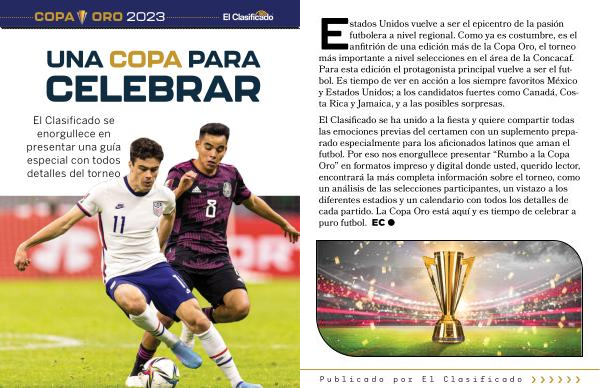 El Clasificado se ha unido a la fiesta y quiere compartir todas las emociones previas del certamen con un suplemento preparado especialmente para los aficionados latinos que aman el futbol . Por eso nos enorgullece presentar “ Rumbo a la Copa Oro ” en formatos impreso y digital donde usted , querido lector , encontrará la más completa información sobre el torneo , como un análisis de las selecciones participantes , un vistazo a los diferentes estadios y un calendario con todos los detalles de cada partido . La Copa Oro está aquí y es tiempo de celebrar a puro futbol . EC ●