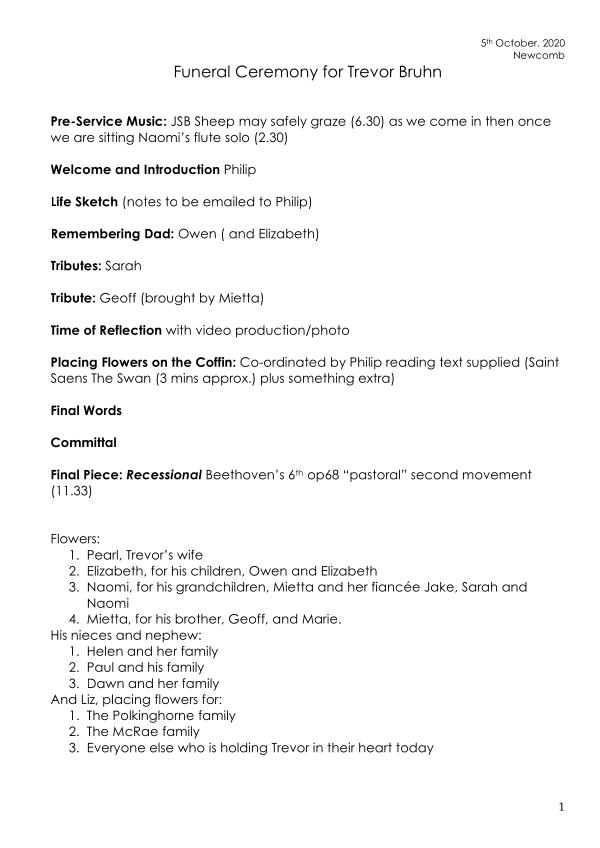 Flowers : 1 . Pearl , Trevor ’ s wife 2 . Elizabeth , for his children , Owen and Elizabeth 3 . Naomi , for his grandchildren , Mietta and her fiancée Jake , Sarah and