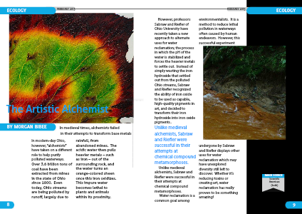 However, professors Sabraw and Riefler of Ohio University have recently taken a new approach to alternate uses for water reclamation; the process in which the pH of the water is stabilized and forces the heavier metals to settle out. Instead of simply wasting the iron hydroxide that settled out from the polluted Ohio streams, Sabraw and Riefler recognized the ability of iron oxide to be used as capable, high-quality pigments in art, and decided to transform their iron hydroxide into iron oxide pigments..