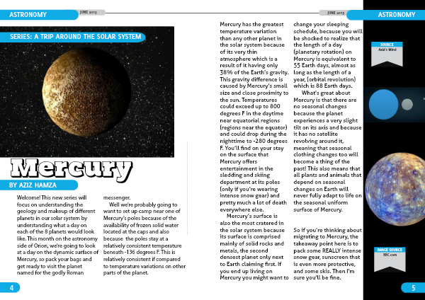 Welcome! This new series will focus on understanding the geology and makeup of different planets in our solar system by understanding what a day on each of the 8 planets would look like. This month on the astronomy side of Orion, we’re going to look at a day on the dynamic surface of Mercury, so pack your bags and get ready to visit the planet named for the godly Roman messenger.