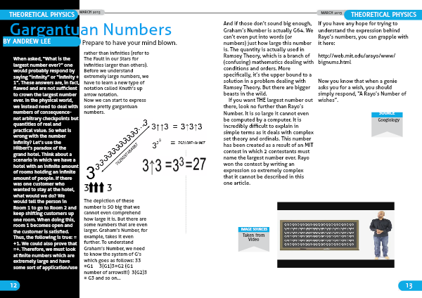 When asked, “What is the largest number ever?” one would probably respond by saying “infinity” or “infinity + 1”. These answers are, in fact, flawed and are not sufficient to crown the largest number ever. In the physical world, we instead need to deal with numbers of consequence- not arbitrary checkpoints but quantities of real and practical value. So what is wrong with the number infinity? Let’s use the Hilbert’s paradox of the grand hotel. Think about a scenario in which we have a hotel with an infinite amount of rooms holding an infinite amount of people. If there was one customer who wanted to stay at the hotel, what would we do? We would tell the person in Room 1 to go to Room 2 and keep shifting customers up one room. When doing this, room 1 becomes open and the customer is satisfied. Thus, the following is true: =+1. We could also prove that =+. Therefore, we must look at finite numbers which are extremely large and have some sort of application/use
