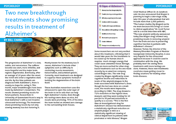 Some researchers are not very excited about this treatment, criticizing that it would take years for the treatments to be scaled up for human since it requires much stronger energy that could cause unwanted tissue damage. They are more excited for other drug-based treatments such as the one made recently by an american company called Biogen Idec. The new drug created by Biogen significantly slows cognitive decline and reductions in levels of the amyloid plaques in the brain associated with Alzheimer's. Even though the test was done on a small-scale, the results were impressive.