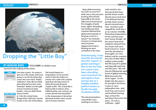 In 1945, the United States dropped the “Little Boy” (atomic bomb) on the city of Hiroshima. This bomb blazed at a temperature so hot (around 6,000°C) that the clothes on people over a mile and a quarter away from the hypocenter of where the bomb dropped caught on fire. This sounds like a heinous fate to impose and a hellish heat for sure, and yet, our oceans absorb heat equivalent to the temperature of about two Hiroshima bombs every second due to human activities.