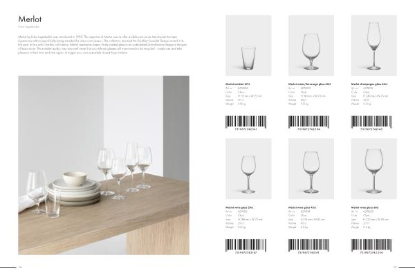 Merlot by Erika Lagerbielke was introduced in 1995 . The objective of Merlot was to offer a tableware series that elevate the taste experience without specifically being intended for wine connoisseurs . The collection received the Excellent Swedish Design award in its first year . In line with Orrefors ’ rich history , Merlot represents classic , finely crafted glass in an understated Scandinavian design in the spirit of less is more . This invisible quality may very well mean that your Merlot glasses will never need to be recycled – simply use and take pleasure in them time and time again , to trigger your own sustainble closed-loop initiative .