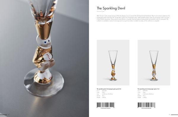 After Gunnar Cyrén passed away in 2013 , the designer ’ s sons reviewed the sketches he had left behind . They found numerous sketches of a champagne glass inspired by the ” Snaps Devil ” glass . The champagne glass , called Sparkling Devil , went into production and is now part of the Orrefors assortment . The product is mouth-blown in Sweden and each glass is hand-painted with details in real 21 carat gold . The collection is available in several colorways and a unique new edition is added annually until the collection is complete .