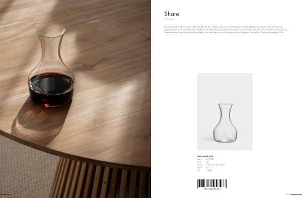Med allroundkaraffen Share kombinerar Pia Törnell klassiska drag och samtida elegans. Både stadig och smäcker, med en bekvämt greppbar hals och hällvänligt avslut. Tanken är att Share ska vara lika bra för vatten, juice och saft, som den är för att lufta och servera vin. Passande nog är den lilla modellen perfekt för en halvflaska vin, och den större för en helflaska. Serien från Orrefors lanserades 2019.