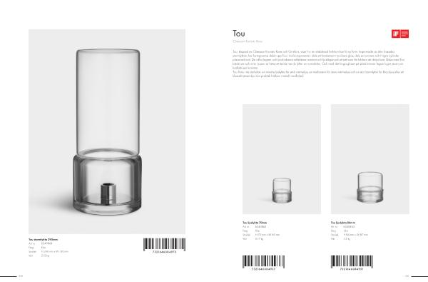 Tou, skapad av Claesson Koivisto Rune och Orrefors, visar hur en etablerad funktion kan få ny form. Inspirerade av den klassiska stormlyktan, har formgivarna delat upp Tou i två komponenter: dels ett fundament i tjockare glas, dels en tunnare och högre cylinder placerad inuti. De olika lagren och tjocklekarna reflekterar rummet och ljuslågan på ett sätt som får blicken att dröja kvar. Duka med Tou både ute och inne. Ljusen är lätta att tända när du lyfter av överdelen. Och med det höga glaset på plats brinner lågan lugnt, även om kvällsbrisen kommer. Tou finns i tre storlekar: en mindre ljuslykta för små värmeljus, en mellanstor för stora värmeljus och en stor stormlykta för blockljus eller ett klassiskt stearinljus( en praktisk hållare i metall medföljer).
