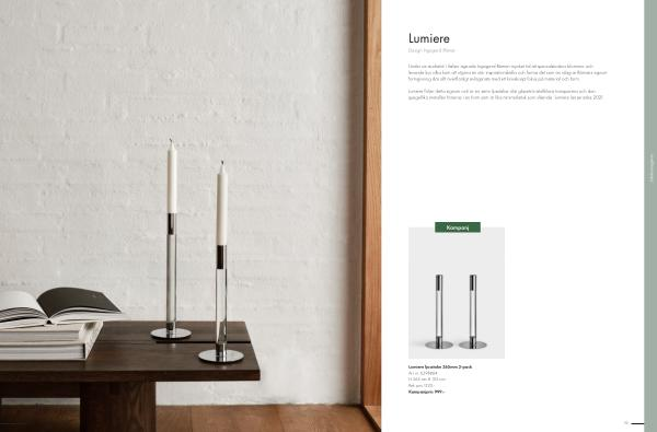 Lumiere följer detta signum och är en serie ljusstakar där glasets kristallklara transparens och den spegellika metallen förenas i en form som är lika minimalistisk som slående. Lumiere lanserades 2021.