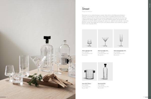 Manhattan är ett av världens bartätaste områden. Vanan att ta en drink tillsammans på takbarer, finkrogar och kvarterskrypin har alltid varit en naturlig del av storstadslivet. Med barserien Street förde Jan Johansson samman Orrefors skandinaviska designtradition med inspiration från New Yorks världsberömda rätlinjiga rutsystem av gator och avenyer. Kristallens krispiga renhet går igenom alla glastyperna, som finns för allt från champagne till cognac och – självklart i sammanhanget – dry martini. Dessutom omfattar Street både karaff och ishink, med nattsvarta detaljer som kontrasterar mot glasets klarhet. Serien lanserades 2006.