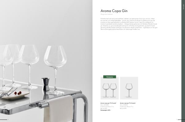 Få drinkar kan konkurrera med enkelheten, friskheten och stjärnstatusen hos en gin och tonic. Oftast serveras den i ett vanligt highballglas – gott så, men Orrefors vill erbjuda en nytolkning som ger det utrymme och den uppmärksamhet en ordentlig G & T förtjänar. Aroma Copa Gin är designat och utvecklat i samarbete med Jens Josefsson – Sveriges främsta ginkännare och författare till boken Svensk gin. Glaset har en generös ballongformad kupa för att förhöja smakupplevelsen, ge plats för kreativ garnering, behålla drycken kall längre och erbjuda en elegant presentation – egenskaper som har gjort denna serveringsstil populär bland barer och restauranger världen över.