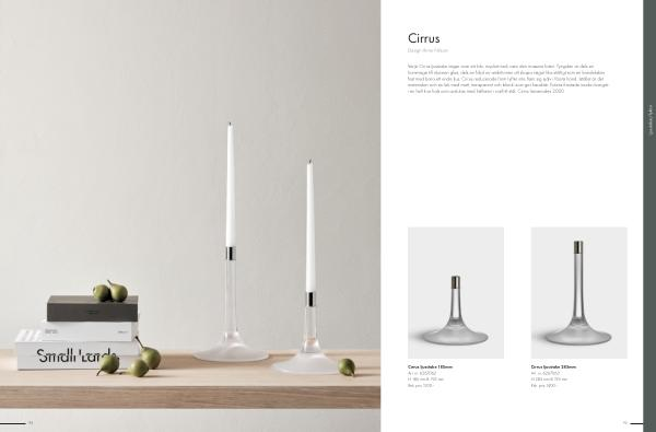 Varje Cirrus ljusstake väger över ett kilo, mycket tack vare den massiva foten. Tyngden är dels en hommage till råvaran glas, dels en följd av ambitionen att skapa något lika ståtligt som en kandelaber fast med bara ett enda ljus. Cirrus reducerade form lyfter inte fram sig själv i första hand. Istället är det materialen och en lek med matt, transparent och blankt som ger karaktär. Fotens frostade insida övergår i en helt klar hals som avslutas med hållaren i rostfritt stål. Cirrus lanserades 2020.
