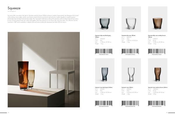 Like many other innovations, the idea for Squeeze arose by chance. While working on another shape entirely, Lena Bergström lost control of the sizzling, viscous glass, and the result was an asymmetrical inward bend. Inspired by her mistake, Bergström created Squeeze, intentionally reproducing its characteristic shape. The“ squeezed” indentations interrupt the symmetry, while simultaneously serving a clear function: flowers placed inside are neatly held together rather than spread out, even those with only a few stems. The collection was first launched in 1997 and is available in multiple colors and sizes including the impressive new taller 500 mm version.