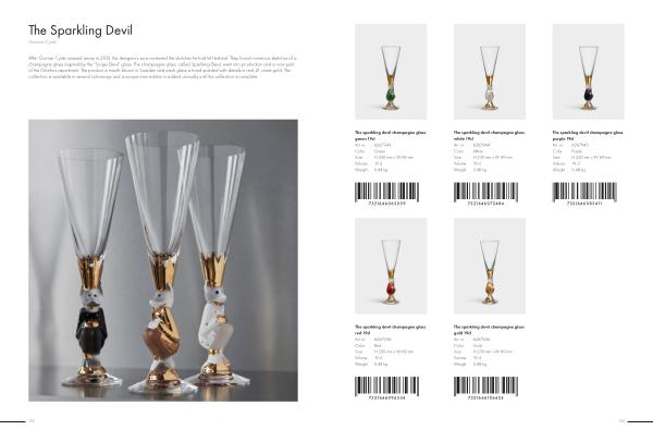 After Gunnar Cyrén passed away in 2013, the designer’ s sons reviewed the sketches he had left behind. They found numerous sketches of a champagne glass inspired by the” Snaps Devil” glass. The champagne glass, called Sparkling Devil, went into production and is now part of the Orrefors assortment. The product is mouth-blown in Sweden and each glass is hand-painted with details in real 21 carat gold. The collection is available in several colorways and a unique new edition is added annually until the collection is complete.
