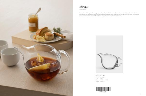 Vicke Lindstrand’ s Mingus is a Swedish glass icon. It was designed for Orrefors in 1934 and has been mouth-blown here in Småland ever since. Mingus was launched as a martini pitcher, but is used just as often for ice water and other cold drinks. The pitcher has won numerous design awards and often represents Swedish glass design at national and international museums.