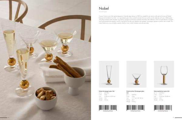 Gunnar Cyrén is one of the great designers in Swedish glass history. In 1991, he created this set, which is still used at the annual Nobel Banquet at Stockholm City Hall – an unparalleled gala where invited laureates from around the world celebrate with over 1,000 guests, including members of the Swedish royal family, prestigious politicians, scientists and artists. The collection, which is mouth-blown in Sweden and hand-painted with details in real 21 carat gold, includes wine glasses, beer glasses, champagne glasses, a pitcher and a carafe. The entire Nobel set is now a highly coveted collectors’ item, in both Sweden and internationally.