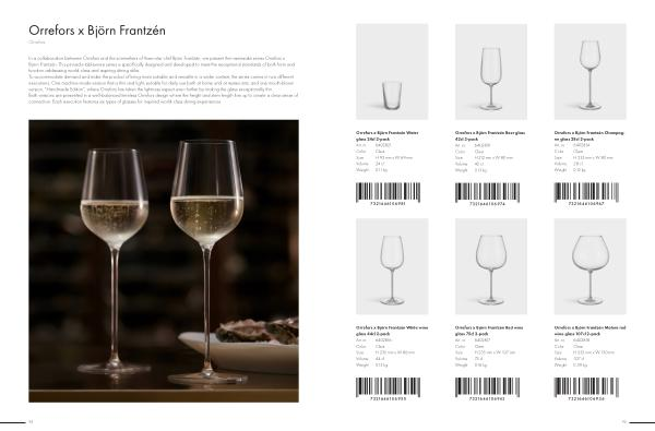In a collaboration between Orrefors and the sommeliers of three-star chef Björn Frantzén, we present the namesake series Orrefors x Björn Frantzén. This pinnacle tableware series is specifically designed and developed to meet the exceptional standards of both form and function addressing world-class and aspiring dining alike. To accommodate demand and make the product offering more suitable and versatile in a wider context, the series comes in two different executions. One machine-made version that is thin and light, suitable for daily use both at home and at restaurants, and one mouth-blown version,“ Handmade Edition”, where Orrefors has taken the lightness aspect even further by making the glass exceptionally thin. Both versions are presented in a well-balanced timeless Orrefors design where the height and stem length line up to create a clear sense of connection. Each execution features six types of glasses for inspired world-class dining experiences.