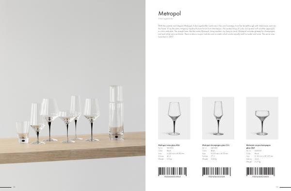 With the austere and elegant Metropol, Erika Lagerbielke continues in her own footsteps, from her breakthrough with Intermezzo and into the future. It has the same intriguing mystery that we know from Intermezzo- the sealed drop of color- but paired with another approach to color and style. The straight lines, like the name Metropol, bring modern city living to mind. Metropol includes glasses for champagne, red and white wine and beer. There is also a coupe, tumbler and a carafe which works equally well for water and wine. The series was launched in 2017.