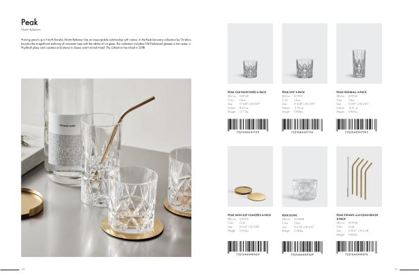 Having grown up in North Karelia , Martti Rytkönen has an inescapable relationship with nature . In the Peak barware collection by Orrefors , he pairs the magnificent authority of mountain tops with the ability of cut glass . The collection includes Old Fashioned glasses in two sizes , a Highball glass , and coasters and straws in classic warm-toned metal . The collection launched in 2018 .