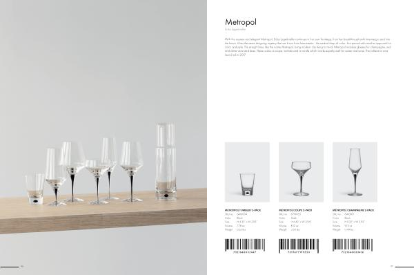 With the austere and elegant Metropol , Erika Lagerbielke continues in her own footsteps , from her breakthrough with Intermezzo and into the future . It has the same intriguing mystery that we know from Intermezzo - the sealed drop of color- but paired with another approach to color and style . The straight lines , like the name Metropol , bring modern city living to mind . Metropol includes glasses for champagne , red and white wine and beer . There is also a coupe , tumbler and a carafe which works equally well for water and wine . The collection was launched in 2017 .