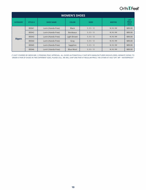 (*) NOT COVERED BY MEDICARE.(‘) PENDING PDAC APPROVAL. ALL SHOES AUTOMATICALLY SHIP WITH MANUFACTURER INSOLES( ORIS). MISMATE SIZING: TO ORDER A PAIR OF SHOES IN TWO DIFFERENT SIZES, PLEASE CALL. WE WILL SHIP ONE PAIR AT REGULAR PRICE, THE OTHER AT HALF OFF. WP = WATERPROOF.”