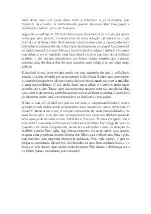 O fato é que, não é fácil ser pai ou ser mãe, a responsabilidade é muito grande e nem todos estão preparados para assumi-la como deveriam. O ideal? O ideal, a meu ver, é um pai consciente de suas possibilidades, de suas limitações, mas que não se esquiva de sua responsabilidade quando acha que pode não dar conta. Enfrenta o“ tranco”. Mostra coragem, vai à luta contra suas más inclinações, contra seus defeitos. Escorrega de vez em quando e não tem vergonha de, nessa hora, estender a mão na direção da mulher e pedir-lhe ajuda. Age dessa maneira até sem saber que, assim, mostra uma grandeza imensa diante dos filhos que o observam. Esses pais, que existem sim, também merecem aplausos. Pois, vão contra o que se prega na sociedade. São ativos, são dotados de uma humanidade linda e, ao meu ver, são muito, mas muito mais homens. Eles fazem a diferença para os filhos, para a sociedade, para mundo!