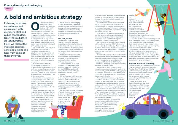 And you asked us to detail how the strategy will be delivered and how RCOT will report on and be accountable for delivery . We will produce an annual impact report detailing our progress and provide regular updates on our EDB-related activities in our communications , including this magazine .