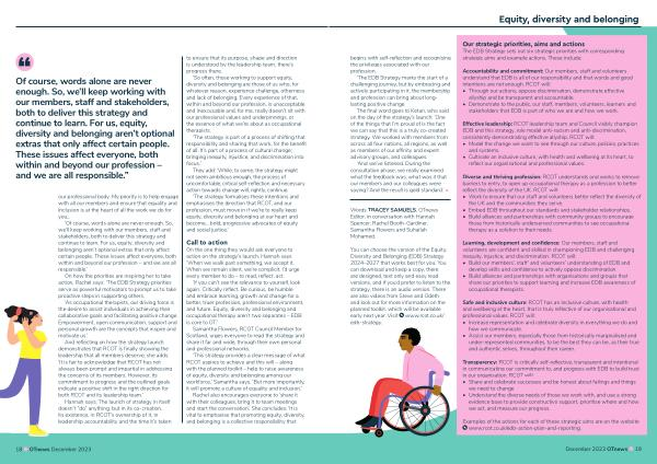 You can choose the version of the Equity , Diversity and Belonging ( EDB ) Strategy 2024 – 2027 that works best for you . You can download and keep a copy , there are designed , text only and easy read versions , and if you ’ d prefer to listen to the strategy , there is an audio version . There are also videos from Steve and Odeth and look out for more information on the planned toolkit , which will be available early next year . Visit www . rcot . co . uk / edb-strategy .