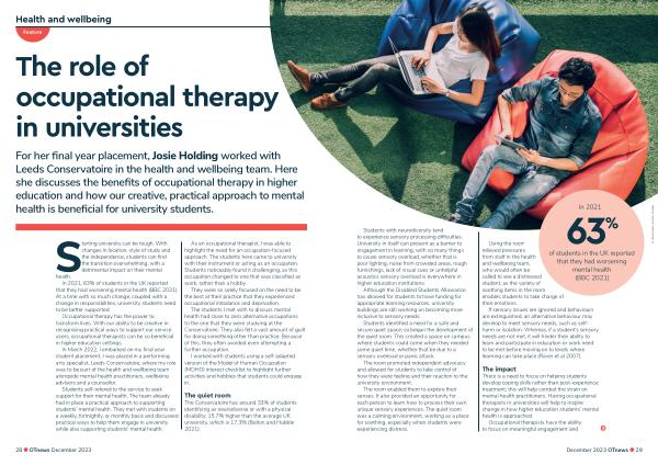 There is a need to focus on helping students develop coping skills rather than post-experience treatment ; this will help combat the strain on mental health practitioners . Having occupational therapists in universities will help to inspire change in how higher education students ’ mental health is approached .