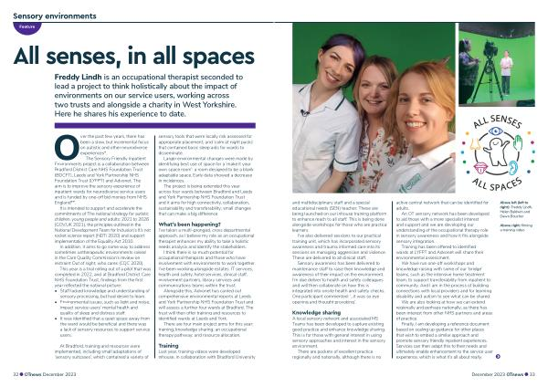 Freddy Lindh is an occupational therapist seconded to lead a project to think holistically about the impact of environments on our service users , working across two trusts and alongside a charity in West Yorkshire . Here he shares his experience to date .