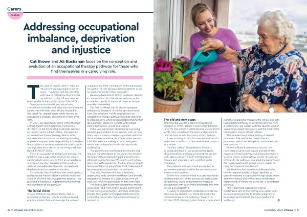 Band 6 occupational therapist , the clinical lead soft launched the pathway by accepting referrals from a community care worker with the specific remit of supporting unpaid care-givers , and the third sector organisation Carers of East Lothian .