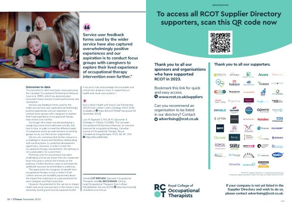 Service user feedback forms used by the wider service have also captured overwhelmingly positive experiences and our aspiration is to conduct focus groups with caregivers to explore their lived experience of occupational therapy intervention even further .”