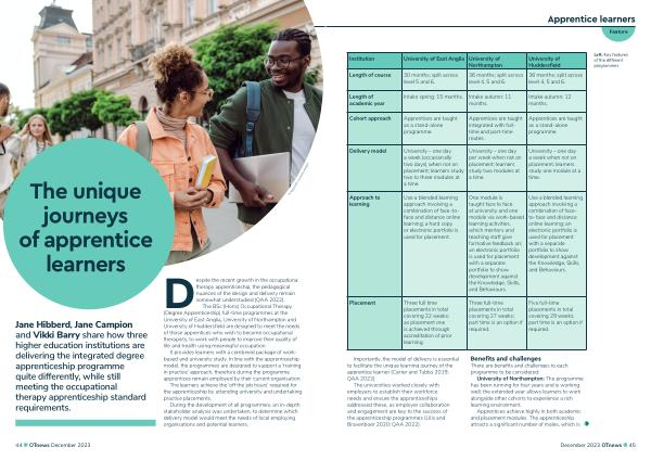 Jane Hibberd , Jane Campion and Vikki Barry share how three higher education institutions are delivering the integrated degree apprenticeship programme quite differently , while still meeting the occupational therapy apprenticeship standard requirements .
