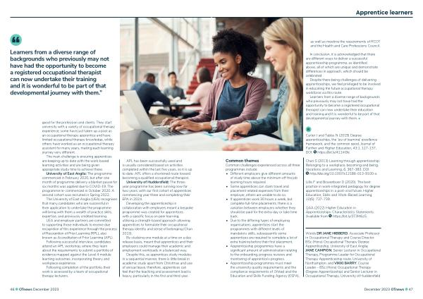 Words DR JANE HIBBERD , Associate Professor in Occupational Therapy and Course Director BSc ( Hons ) Occupational Therapy Degree Apprenticeship , University of East Anglia ; JANE CAMPION , Senior Lecturer in Occupational Therapy , Programme Leader for Occupational Therapy Apprenticeship route , University of Northampton ; and VIKKI BARRY , Course Leader – BSc ( Hons ) Occupational Therapy ( Degree Apprenticeship ) and Senior Lecturer in Occupational Therapy , University of Huddersfield