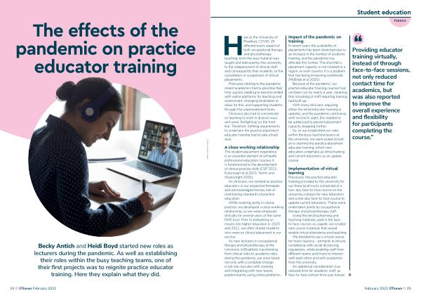 H ere at the University of Bradford , COVID-19 affected every aspect of both occupational therapy and physiotherapy teaching ; from the way material was taught and delivered by the university , to the redeployment of clinical staff , and consequently their students , to the cancellation or suspension of clinical placements .