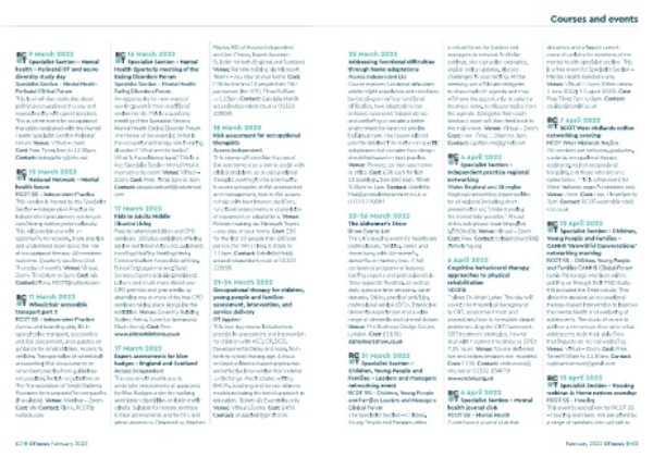 National Network – Mental health forum RCOT SS – Independent Practice This session is hosted by the Specialist Section – Independent Practice for independent practitioners working or considering working internationally . This will provide you with an opportunity to network , share practice and understand more about the role of occupational therapy . All members welcome . Quarterly sessions ( 2nd Thursday of month ). Venue : Virtual , Zoom . Time : 4pm to 5pm . Cost : n / a . Contact : Fiona , RCOT @ outlook . com