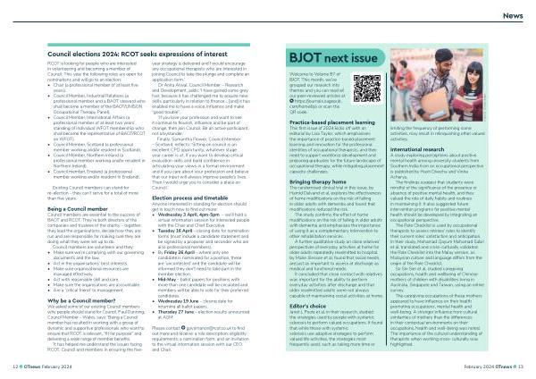 ‘ It has helped me understand the issues facing RCOT , Council and members in ensuring the fiveyear strategy is delivered and I would encourage any occupational therapists who are interested in joining Council to take the plunge and complete an application form .’