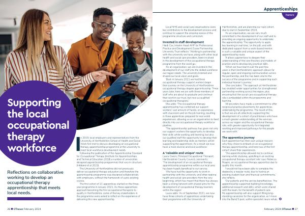 Laura Owers , Principal Occupational Therapist , Hertfordshire County Council , comments : ‘ The development of an occupational therapy apprenticeship programme within our local area has been hugely beneficial to our service .