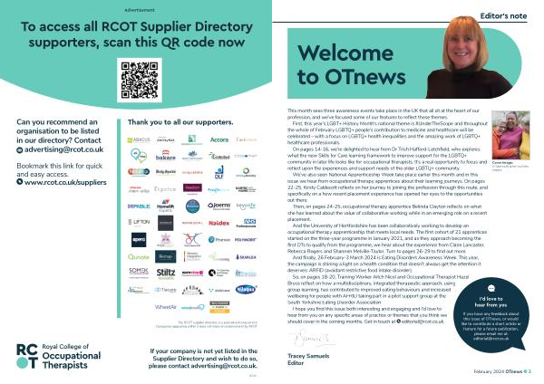 I hope you find this issue both interesting and engaging and I ’ d love to hear from you on any specific areas of practice or themes that you think we should cover in the coming months . Get in touch at editorial @ rcot . co . uk .