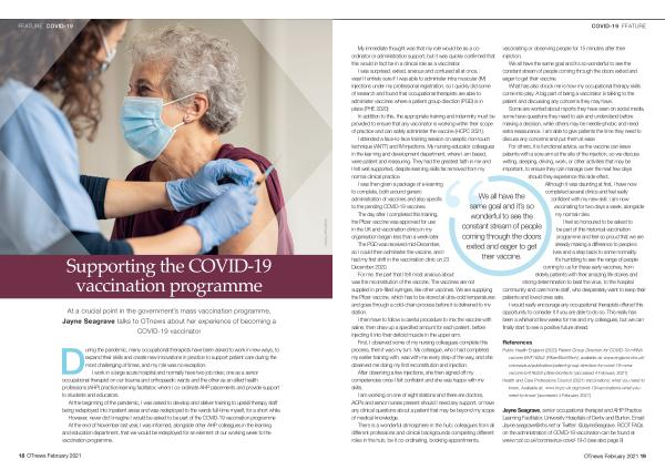 Jayne Seagrave , senior occupational therapist and AHP Practice Learning Facilitator , University Hospitals of Derby and Burton . Email : Jayne . seagrave @ nhs . net or Twitter : @ JayneSeagrave . RCOT FAQs on the administration of COVID-19 vaccination can be found at : www . rcot . co . uk / coronavirus-covid-19-0 ( see also page 9 )