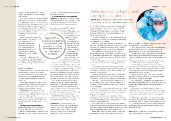 ‘ I found redeployment a useful addition of knowledge , skills and awareness ; as occupational therapists are dual trained in mental and physical health , I felt able to absorb this knowledge for use in my future practice .’
