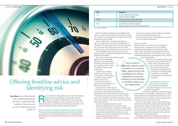Risk of malnutrition in older patients under our care has increased during the coronavirus pandemic . Here Sue Baic , registered dietitian and consultant to Wiltshire Farm Foods , explores how occupational therapists can play an important role as part of the multidisciplinary team in optimising outcomes through good nutrition in their patients , especially when direct access to dietitians is restricted .