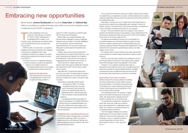 Senior lecturer Joanne Donbavand and students Kelly Adair and Edward Nye , reflect on providing occupational therapy input within a community respiratory team , in response to the COVID-19 pandemic
